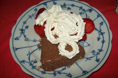 Das Abendessen war gut. Salat, Spargel und eine undefinierbare Nachspeise, eine Art Schokopudding mit Popcorn, Schokolade und Banane. Gefroren das Ganze. Er nennt das ein ein: Parfait von Banane, Bitterscholade, Minzcreme und Johurt!