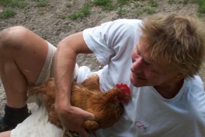 Hier noch mal Embert beim engagierten Fangen eines Vogels (Huhn).